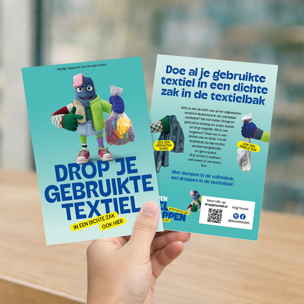 Hoi, leuk dat je het vraagt. Ik ben Texxie. Als je mij ziet op posters, stickers, socials of in de nieuwsbrief, dan gaat ’t over circulair textiel en textielinzameling. Samen leren we meer over de textielstroom en gaan we meer droppen, zo houden we waardevol textiel in omloop.